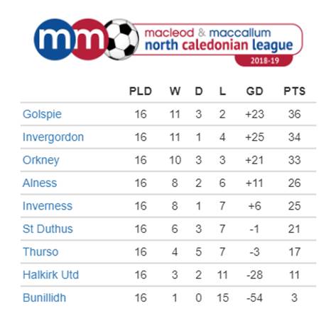 NCFA League table – season 2018/19